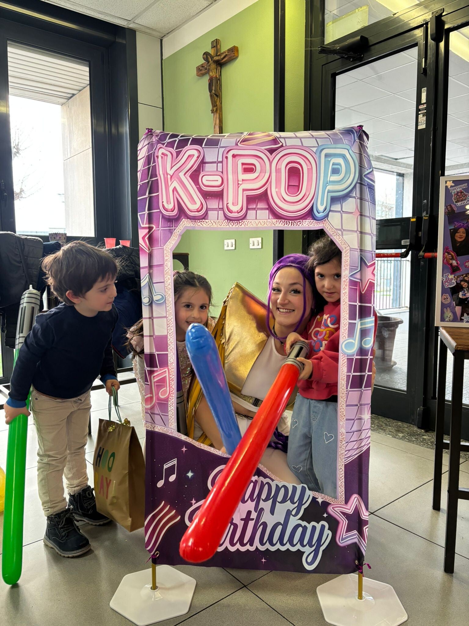 Un momento clou della festa è l'arrivo a sorpresa di un personaggio K-Pop (la nostra mascotte)! Porterà ancora più magia e interazione, per foto indimenticabili e momenti di pura gioia che renderanno la festa ancora più speciale e memorabile per tutti i presenti.